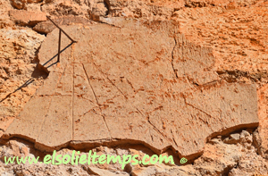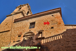 :: DESCRIPCIÓ: Fragment d'un rellotge vertical de matí, algunes línies horàries, sense numeració evident, gnòmon (30 cms.) recolzat, elevació 757 mts. snm.