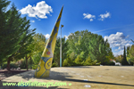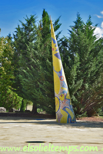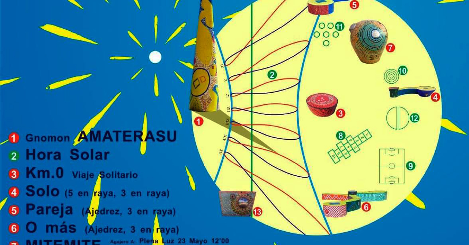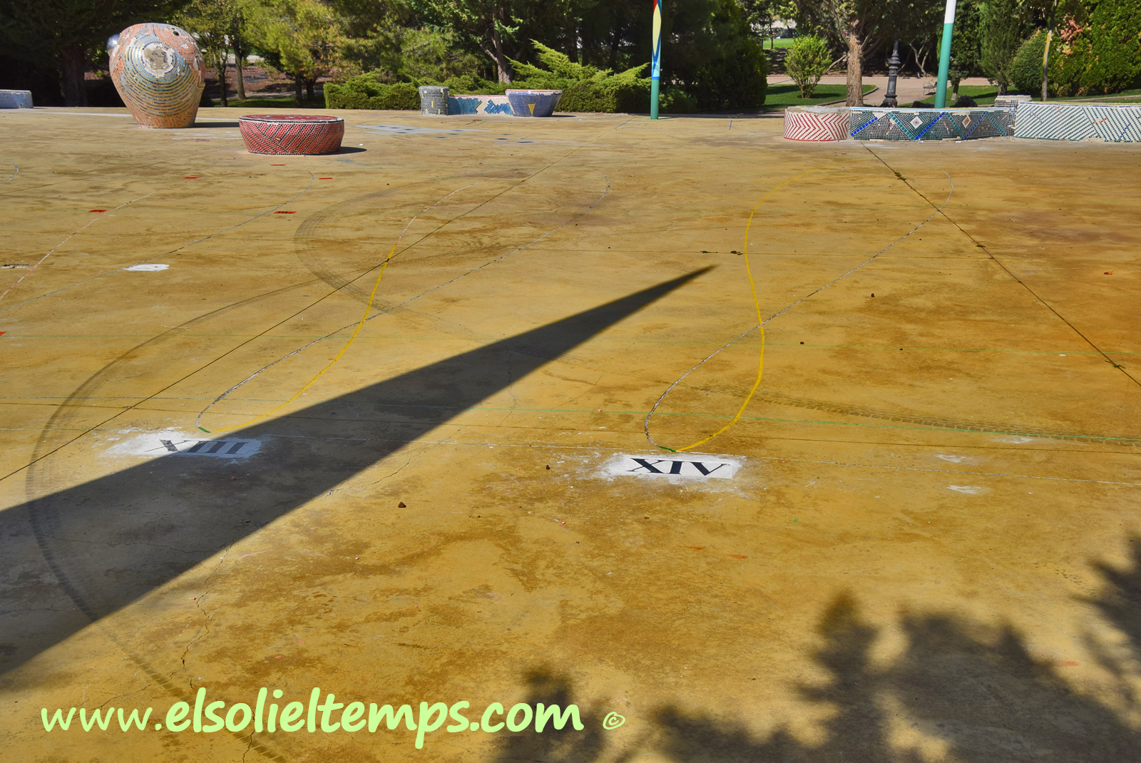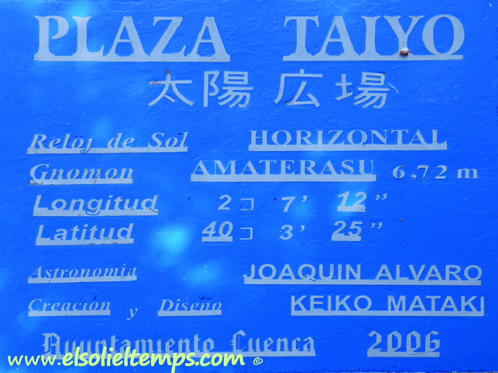 :: DESCRIPCIÓ: Quadrant horitzontal de grans dimensions, projectat sobre la plaça publica, analemes a les hores, solsticis i equinoccis, números romans (de IX a XV), gnòmon ''Amaterasu'' (6.72 mts.) cònic, signat i datat, elevació 954 mts. snm.