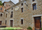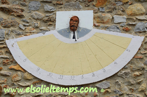 :: DESCRIPCIÓ: Vertical semicircular de mati, línies horàries, numeració aràbiga (de 8 a 5) en corona, gnòmon (30 cms.) recolzat, figura humana al pol, elevació 285 mts. snm.