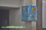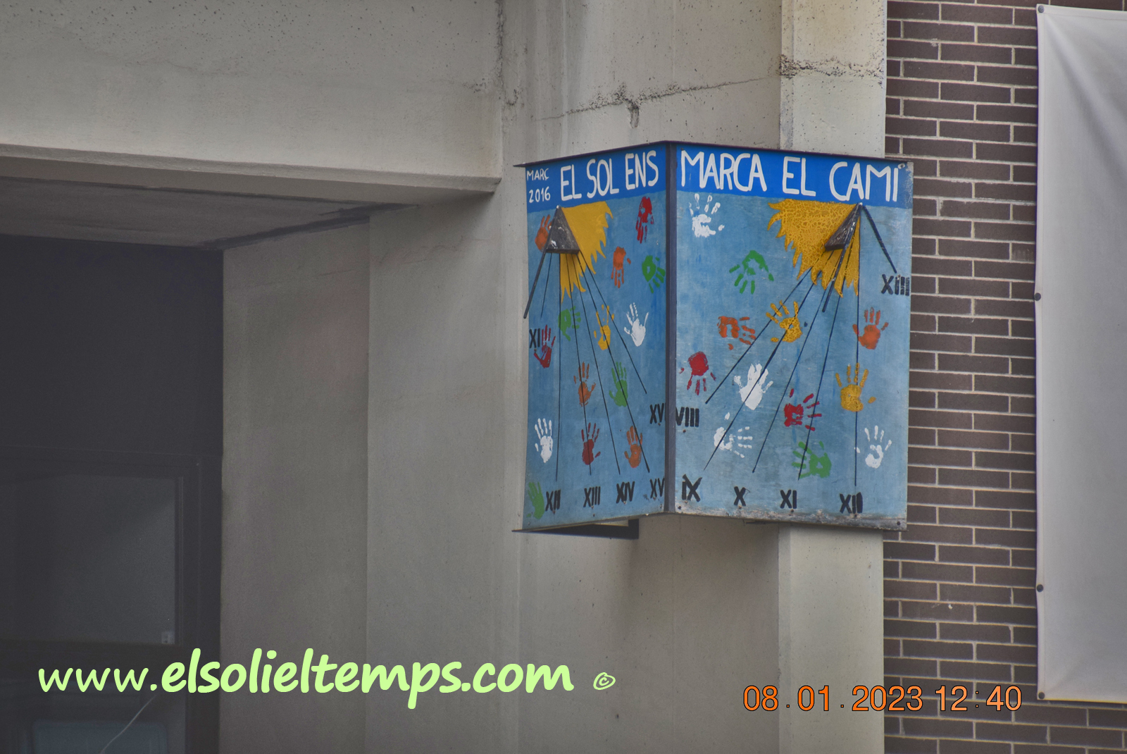 :: DESCRIPCIÓ: Doble rellotge vertical en angle al pati de l'escola, el de tarda: línies horàries, números romans (de XI a XVI), gnòmon (25 cms.) recolzat en triangle, lema, datat, elevació 2 mts. snm.