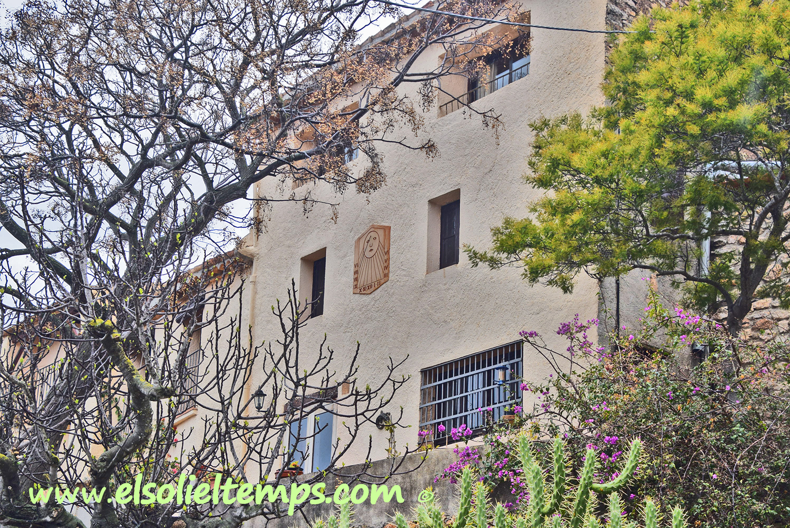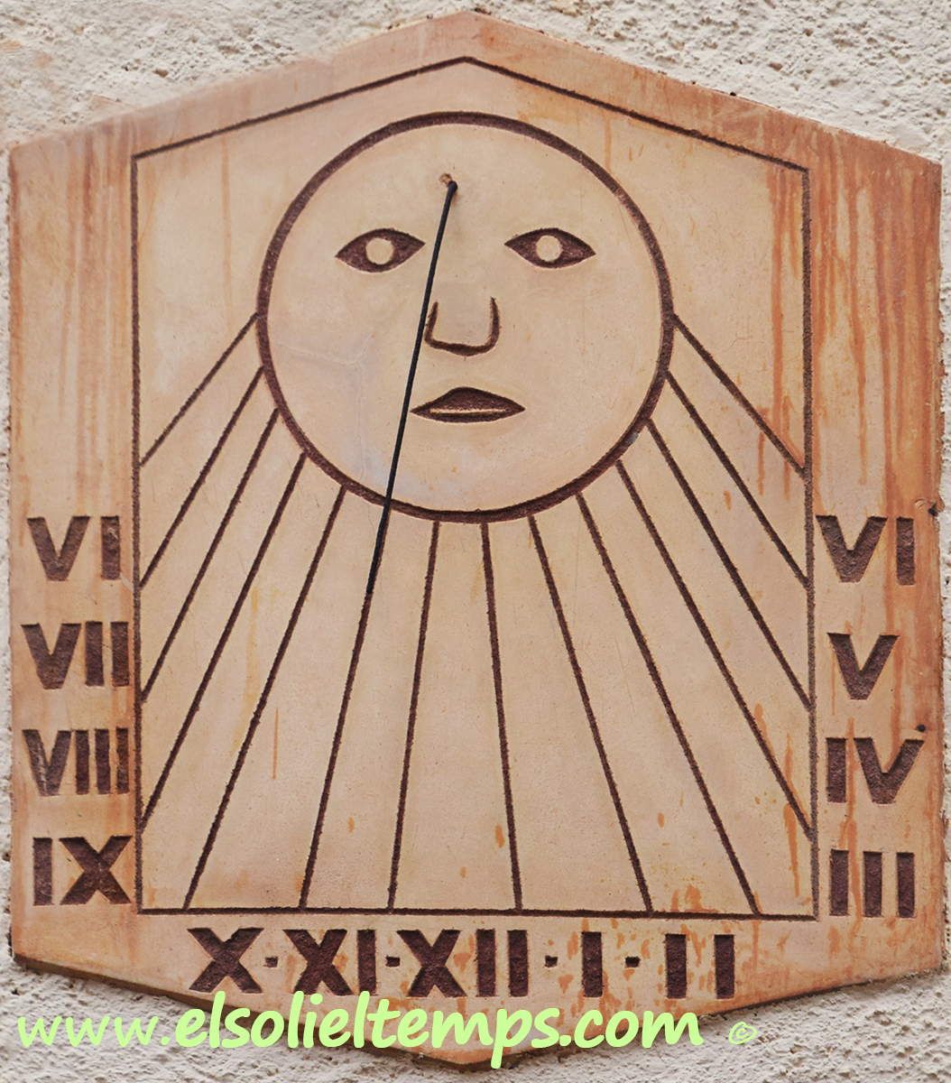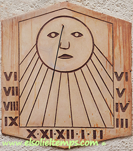 :: DESCRIPCIÓ: Vertical de tarda, línies horàries, sol antropomorf al pol, números romans en marc, gnòmon (50 cms.) vareta, elevació 206 mts. snm.