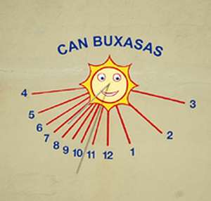 :: DESCRIPCIÓ: Senzill rellotge pintat a la façana posterior de la casa de pisos (es veu des del carrer de darrere). Nums àrabs (de 4 a 3), línies horàries, un sol rialler al pol, orient Est