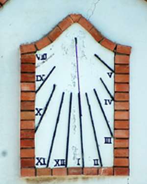 :: DESCRIPCIÓ: Vertical, de totxana de conjunt amb l’arquitectura de l’edifici, línies horàries, números romans (de VIII a V), orient SW