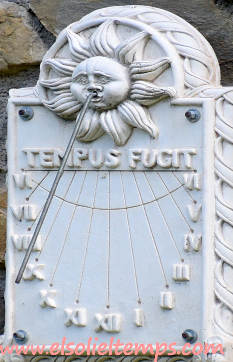 :: DESCRIPCIÓ: Vertical, orientat a ponent, de sèrie, números romans (de VI a VI), línies horàries, equatorial, gnòmon (20 cms.) vareta, lema, elevació 632 mts. snm.