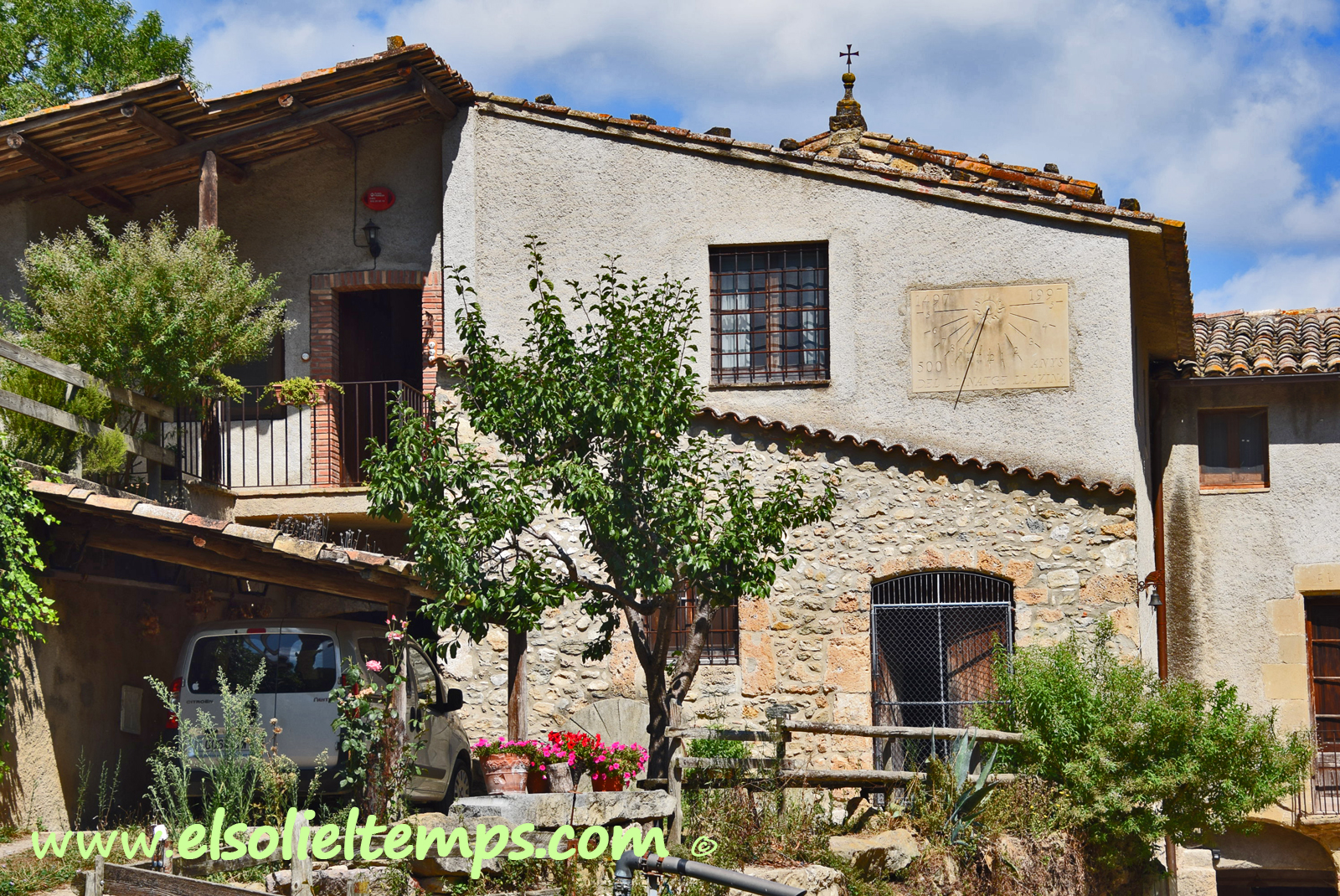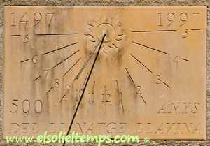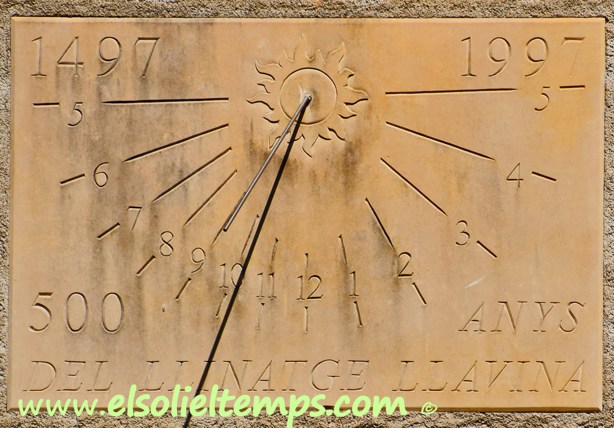 :: DESCRIPCIÓ: Vertical rectangular de matí, de pedra, a la façana de l’antic molí, línies horàries gravades, números àrabs (de 5 a 5), un sol al pol, gnòmon (40 cms.) vareta, datat, elevació 505 mts. snm.
