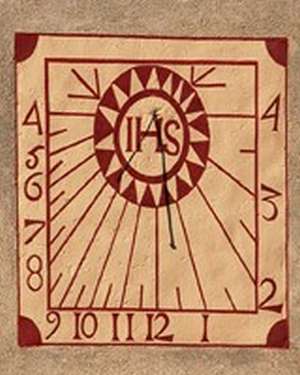 :: DESCRIPCIÓ: Vertical de mati, línies horàries i mitges hores mes curtes, números àrabs (de 4 a 4), gnòmon (50 cms) acabat en bola
