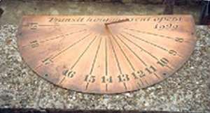 :: DESCRIPCIÓ: Semicircular. Dos rellotges en el canto d’un mur. Mitja esfera està en posició vertical, i l’altra horitzontal, formant un angle de 90º. El gnòmon és una vareta que travessa les dues per l’angle, línies horàries, nums àrabs (de 19 a 8)