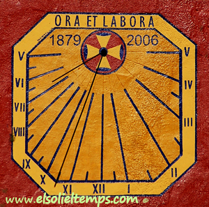 :: DESCRIPCIÓ: Vertical quadrat de matí, línies horàries i mitges hores curtes, números romans (de V a V) en marc, creu de Malta al pol, gnòmon (20 cms) vareta, datat, lema, elevació 61 mts. snm.