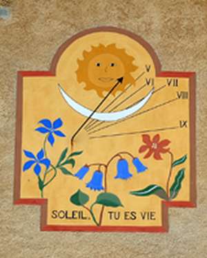 :: DESCRIPCIÓ: Rellotge septentrional, declinant a mati, decoració floral, línies horàries, nums romans (de V a IX), gnòmon (50 cms) vareta acabat en fletxa