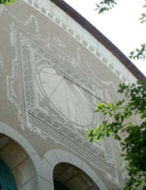 :: DESCRIPCIÓ: Rectangular, modernista, línies horàries i mitges hores mes curtes, nums romans (de X a VII), gnòmon (50 cms) acabat en punta, molt decorat