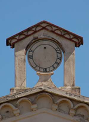 :: DESCRIPCIÓ: Meridional circular, dins una espècie de campanar de cadireta, sense línies horàries, nums romans (de VII a VI) hi ha un error dons el num de les VII del mati es un X, gnòmon (40 cms) vareta