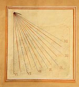 :: DESCRIPCIÓ: Vertical quadrat, de mati, línies horàries i mitges hores, nums romans (VI a XII), gnòmon (15 cms) vareta