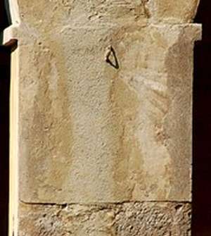 :: DESCRIPCIÓ: Restes d’un rellotge meridional, pintat al fresc, restes de línies, sense numeració, gnòmon absent