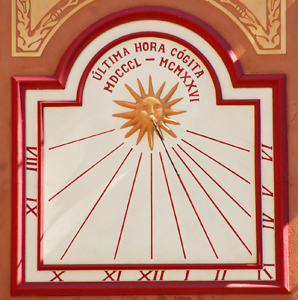 :: DESCRIPCIÓ: Vertical quasi meridional, línies horàries i mitges hores mes curtes, nums romans (de VIII a VI), gnòmon (20 cms) acabat en bola, datat