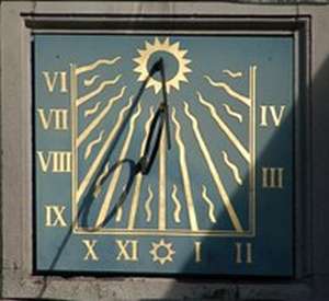 :: DESCRIPCIÓ: Vertical de mati, línies horàries i mitges hores en forma de raigs de sol, nums romans (de VI a IV) en marc, gnòmon (40 cms) recolzat amb cercle