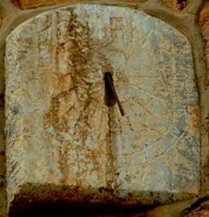 :: DESCRIPCIÓ: Vertical meridional, orientació forçada, línies horàries i mitges hores, números romans (de VI a VI) en corona, gnòmon (15 cms) vareta
