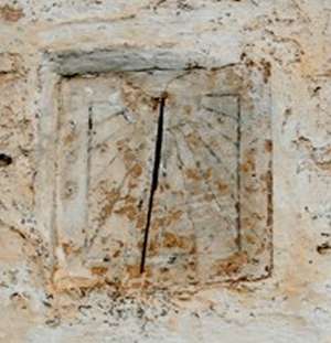 :: DESCRIPCIÓ: Típic rellotge rural vertical quadrat, emblanquinat, línies horàries, números àrabs (de 6 a 6), gnòmon (15 cms) vareta