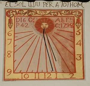 :: DESCRIPCIÓ: Vertical quasi meridional molt decorat, línies horàries i marques a les mitges hores, números àrabs (de 6 a 5) en marc, gnòmon (50 cms) vareta, tort, datat i signada la restauració
