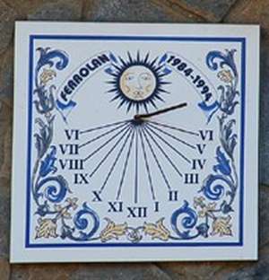 :: DESCRIPCIÓ: Placa ceràmica de sèrie, línies horàries, números romans (de VI a VI), gnòmon (15 cms) vareta, tort