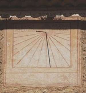 :: DESCRIPCIÓ: Vertical de mati, molt decorat, línies horàries i marques a les mitges hores, els números no es veuen, gnòmon (40 cms) acabat en bola, datat