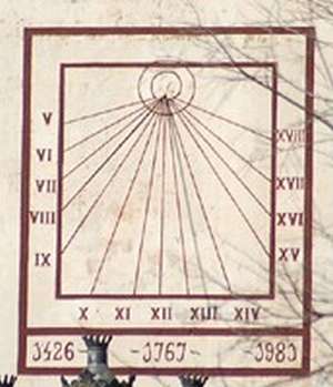 :: DESCRIPCIÓ: Vertical quadrat, quasi meridional, línies horàries, números romans (de V a XVIII) en marc, gnòmon (40 cms) vareta, datat