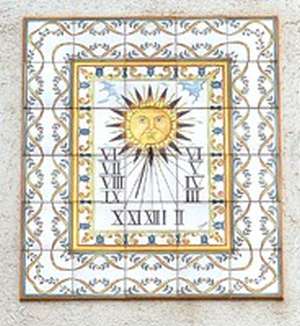 :: DESCRIPCIÓ: Composició de rajoles de ceràmica (5x6), de sèrie, línies horàries, números romans (de VI a VI), gnòmon absent