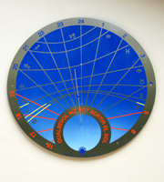 :: DESCRIPCIÓ: Circular orientat al nord, te pintat en vermell les hores que marca i en groc els mesos, línies horàries, calendari zodiacal, números àrabs (de 6 a 16) gnòmon (60 cms) amb bola al mig per marcar el calendari, signat