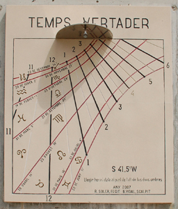 :: DESCRIPCIÓ: Vertical de tarda, línies horàries i mitges hores, números àrabs (de 11 a 6), gnòmon (10 cms) semicircular amb forat al mig, calendari zodiacal, signat i datat