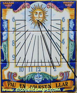 :: DESCRIPCIÓ: Composició de rajoles de ceràmica (3x3), vertical, meridional, línies horàries i mitges hores curtes, números àrabs (de 6 a 6), gnòmon (30 cms.) vareta, lema, signat, elevació 210 mts. snm.