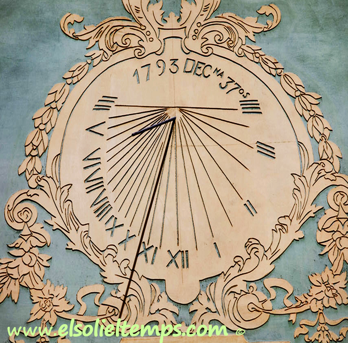 :: DESCRIPCIÓ: Vertical orientat a llevant, línies horàries i mitges hores, numeració en xifres romanes (de IIII a IIII), gnòmon (30 cms) vareta, datat, elevació 105 mts. snm.
