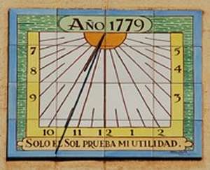 :: DESCRIPCIÓ: Composició de rajoles de ceràmica (4x4), vertical, quasi meridional, línies horàries i mitges hores, nums àrabs (de 7 a 5), gnòmon (25 cms) vareta, signat i datat
