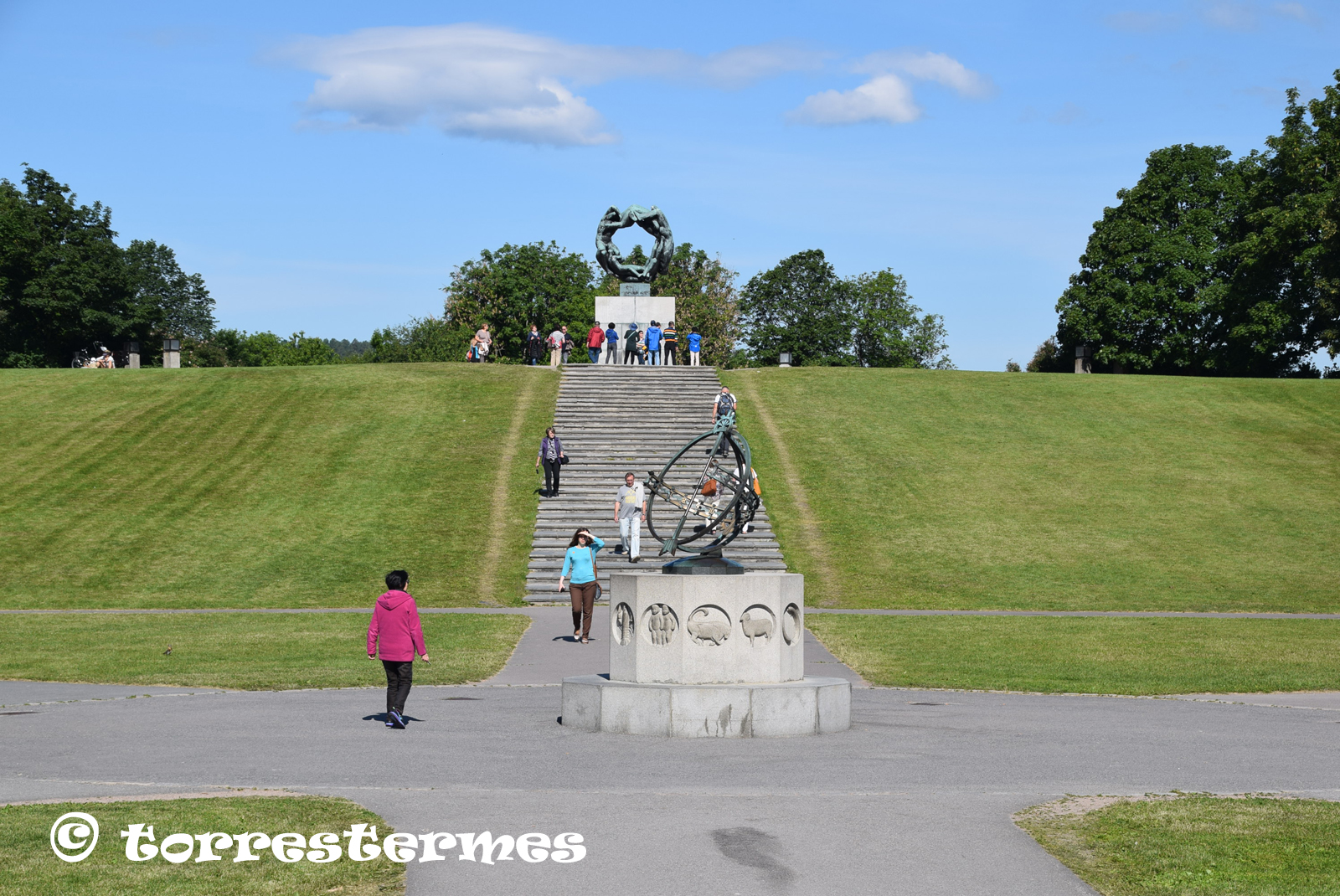 :: NOTES: El parc, dissenyat en la seva totalitat per Gustav Vigeland (1869-1943), compta amb 212 escultures de bronze i granit que representen diferents etapes de la vida i moviments humans, encarnats en figures nues de grans dimensions.