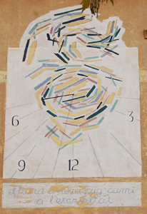 :: DESCRIPCIÓ: Rellotge vertical amb dissenys abstractes moderns, línies horàries, nums àrabs (6, 9, 12 i 5), gnòmon (30 cms) vareta
