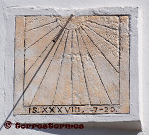 :: DESCRIPCIÓ: Vertical meridional, incrustat a la paret, orientat, línies horàries, sense numeració, gnòmon (20 cms.) acabat en boleta, elevació 21 mts./snm.