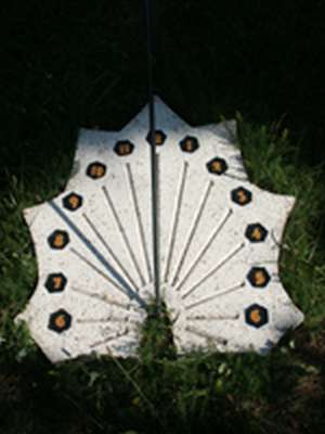 :: DESCRIPCIÓ: Composició d’un rellotge de pedra a terra amb un ferro que a dalt hi te un penell i el suport que el fixa a terra fa de gnòmon. Molt original