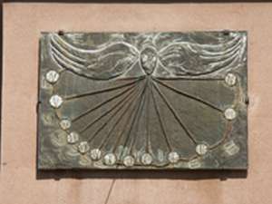 :: DESCRIPCIÓ: Rectangular. Fet pels alumnes de l'Institut amb fusta de tauler marítim, recobert de coure embotit. Línies horàries, xifres romanes de les 4 del matí a les 4 de la tarda, gnòmon (20 cms) vareta