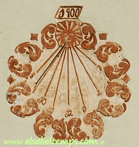 :: DESCRIPCIÓ: Vertical de matí, línies horàries, números àrabs (de 8 a 3), gnòmon (20 cms) acabat en bola, datat, elevació 471 mts. snm.