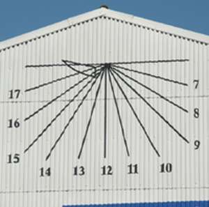 :: DESCRIPCIÓ: Pintat sobre les plaques de material aïllant de la paret lateral de la finca. Línies horàries, nums àrabs (de 17 a 7), gnòmon (25 cms) en forma triangular