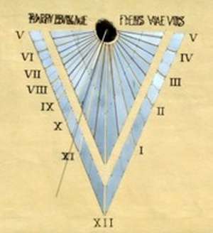 :: DESCRIPCIÓ: Triangular, enganxat a la façana lateral de l’edifici. Números romans (de V a V), línies horàries i mitges hores, gnòmon (30 cms) vareta