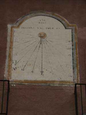 :: DESCRIPCIÓ: Devia haver estat un gran rellotge. Avui esta molt deteriorat. Números àrabs, línies horàries i signes del zodíac