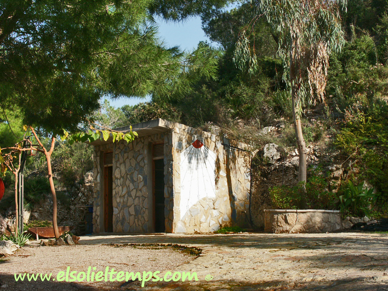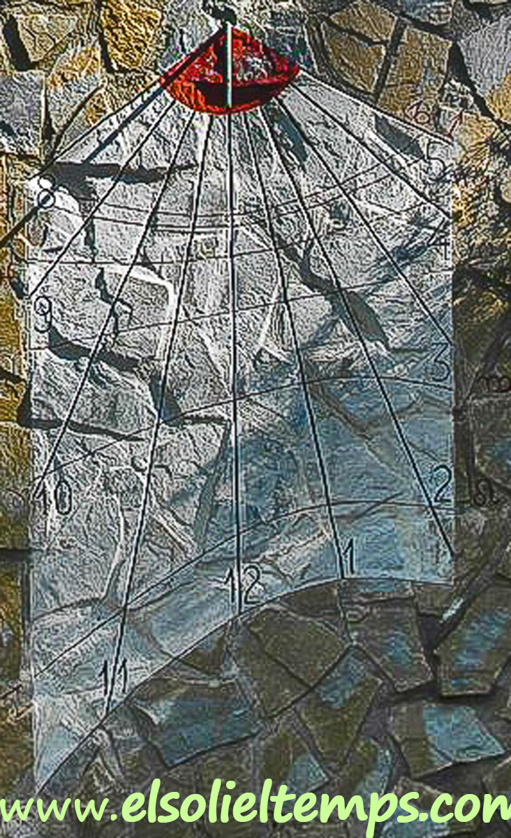 :: DESCRIPCIÓ: Vertical de tarda, de forma irregular, línies horàries, números àrabs (de 8 a 5), corbes de declinació solar, línies i signes zodiacals, gnòmon (50 cms) vareta, signat i datat, elevació 128 mts. snm.