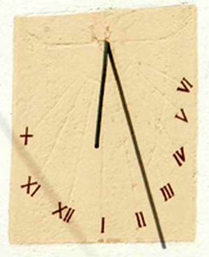 :: DESCRIPCIÓ: Placa de pedra quadrada amb les línies horàries gravades i els números (romans de X a VI) pintats, gnòmon (25 cms) vareta