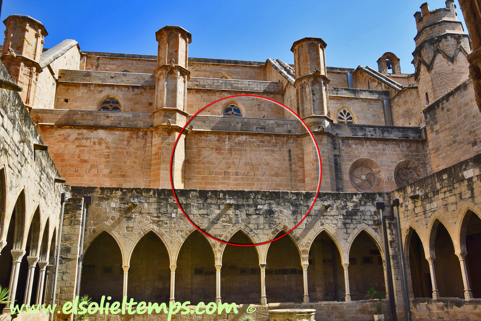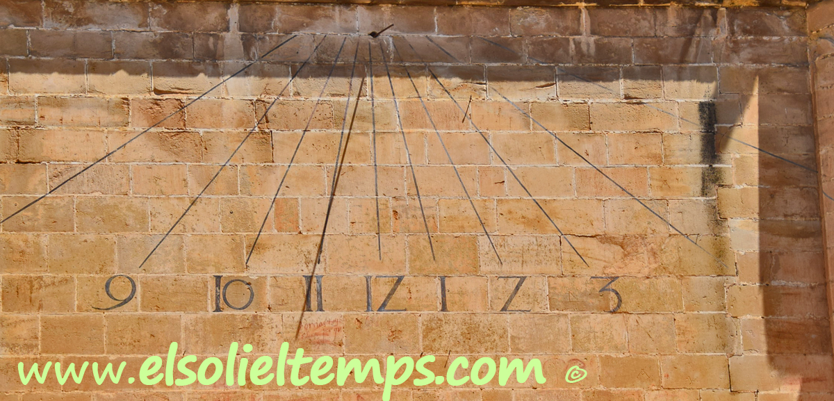 :: DESCRIPCIÓ: Vertical de tarda, pintat al lateral de la nau que dona al claustre, una mica esborrat, línies horàries, numeració aràbiga(de 9 a 3), gnòmon (15 cms.) vareta, elevació 12 mts. snm.