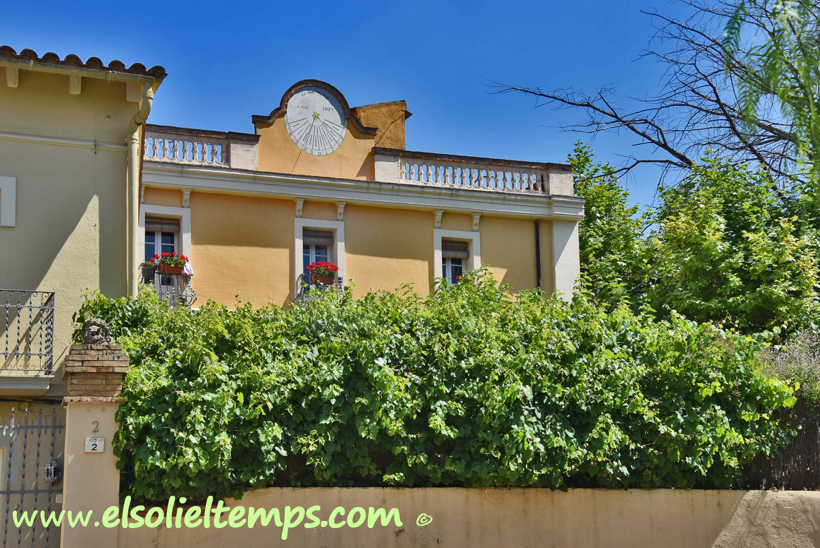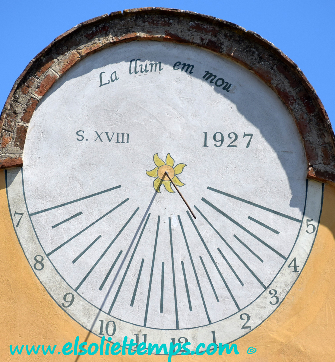 :: DESCRIPCIÓ: Circular vertical, línies horàries i mitges hores mes curtes, números àrabs (de 7 a 5) dins una corona, gnòmon (40 cms) vareta, datat, elevació 371 mts. snm.