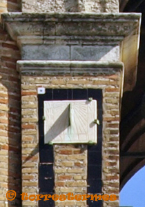:: DESCRIPCIÓ: Rellotge de campaner situat a la part alta de la torre, fa parella amb el que esta situat a la cara sud, línies horàries, números romans (de VI a VI) en marc, gnòmon (15 cms) triangular, elevació 20 mts.