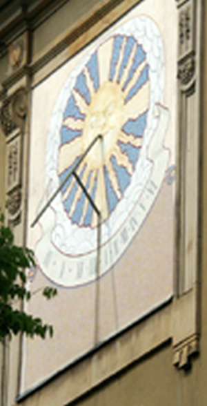 :: DESCRIPCIÓ: Gran rellotge vertical en el lateral de l’escola que dona al pati