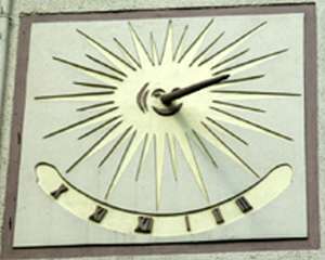 :: DESCRIPCIÓ: Rellotge vertical a la façana d’un edifici de pisos. Gravat amb un sol rient. Números àrabs de les 10 a les 3