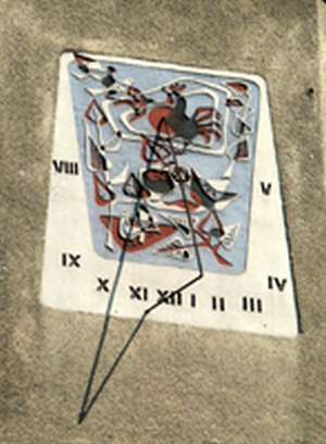 :: DESCRIPCIÓ: Rellotge vertical, esgrafiat, mol decorat, números romans (de VIII a V). Pintura en blau i vermell (galls, ocells, etc.)