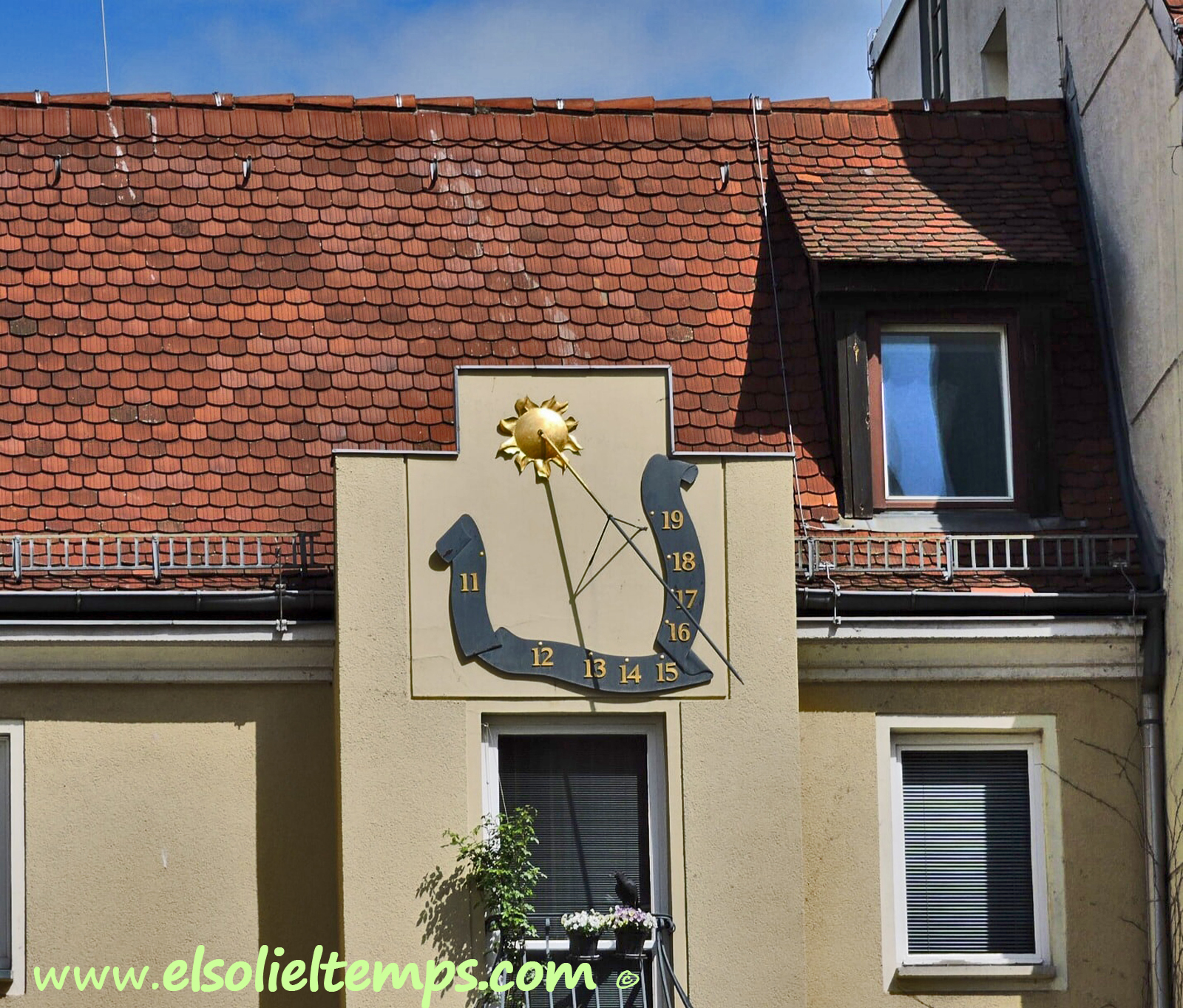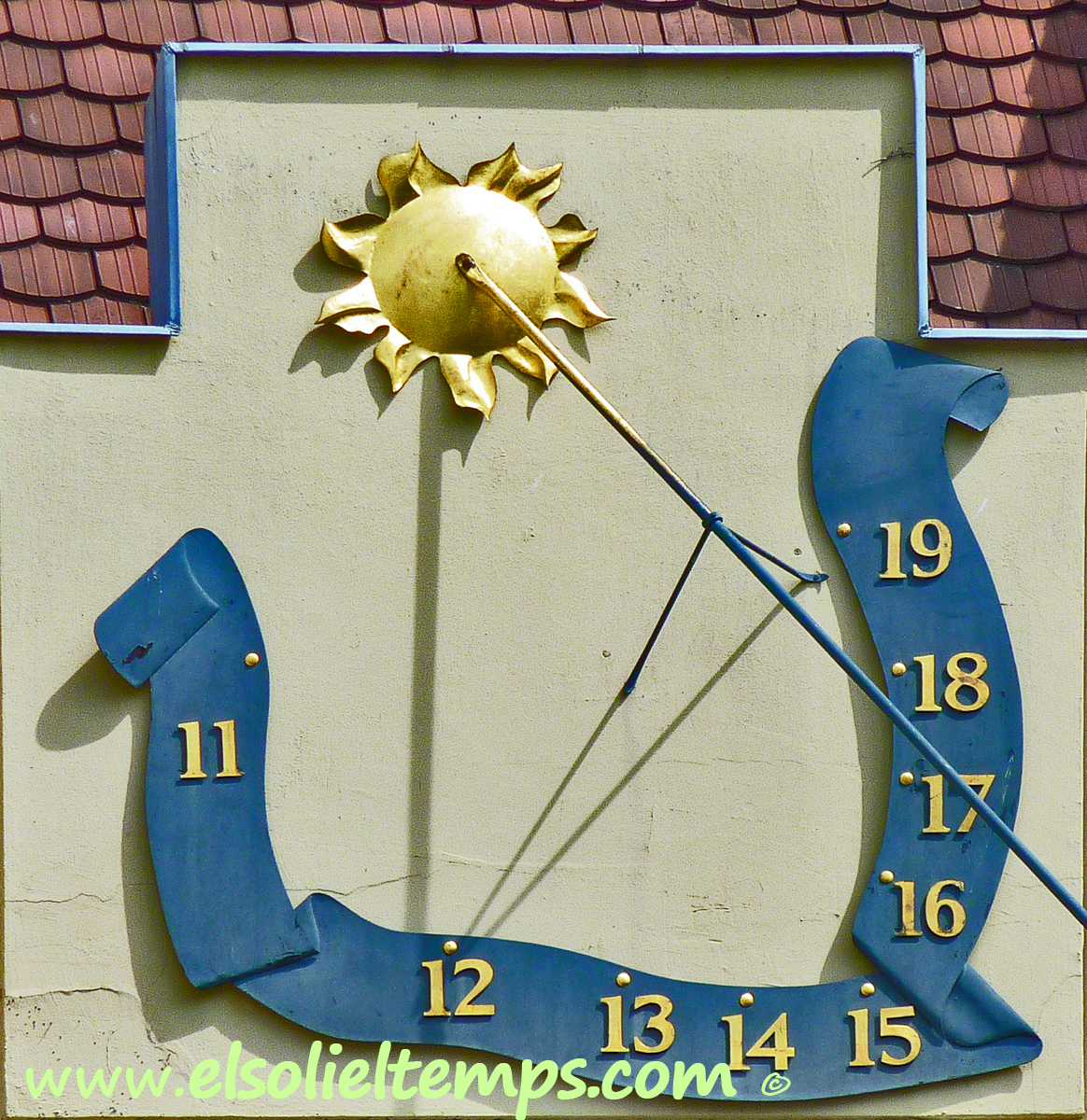 :: DESCRIPCIÓ: Rellotge vertical de tarda, quadrat amb un sol al mig d'on surt el gnòmon (60 cms.) vareta doble recolzament, sense línies, una orla negre amb números àrabs (de 11 a 19), elevació 34 mts. snm.