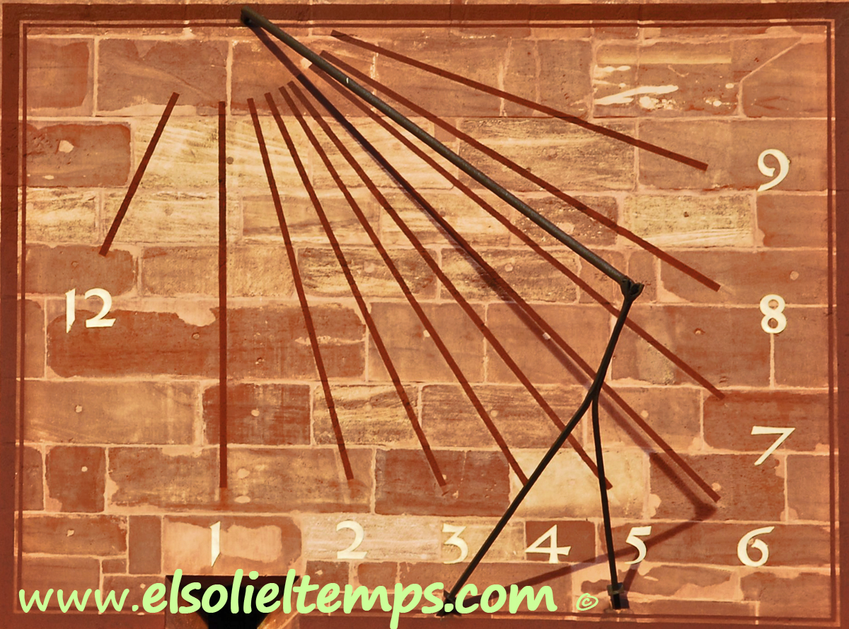 :: DESCRIPCIÓ: Rectangular vertical, força orientat a ponent, línies horàries, numeració aràbiga (de 12 a 8), gnòmon (50 cms.) recolzat amb trípode, elevació 279 mts. snm.